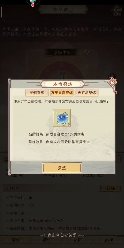 当累计熔炼值达到10000后,恭喜你,本命法宝问世。获得本命法宝后,每天探索出的石头可以继续熔炼获得属性值提升。