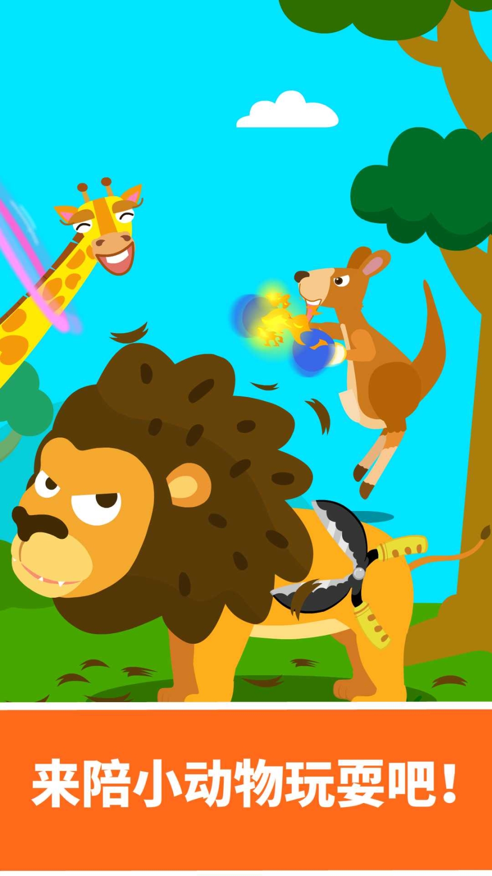 4、【与动物嬉戏】:瞧!每只小动物都有独特本领哟~活泼的小猴子能让手上的球飞速转动!长颈鹿伯伯脖子上的呼啦圈仿佛要飞起来啦!还有擅长拳击的袋鼠妈妈,真是厉害极了…利用多样的道具,小宝宝们可以和小动物们尽情地玩耍嬉戏。在这个过程中,认识并记住这些可爱的小动物们~