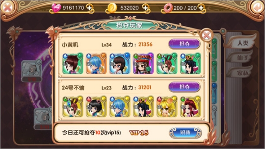 在抢夺玩家一栏下显示你可以抢夺的玩家队伍,以及与你VIP相关的次数,刷新可以获得更换可抢夺玩家,如果遇到战力过高的不如刷新看看。
