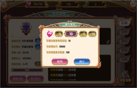 家族共10级,需要成员一同捐献钻石升级,捐献参与钻石消费活动;