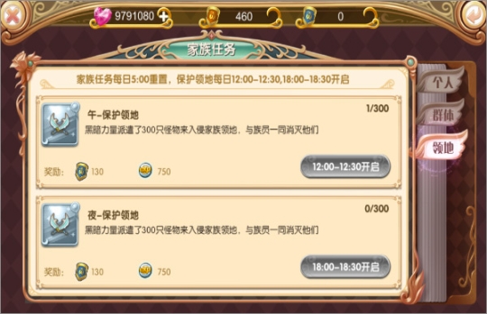 保护领地任务:每日12:00-12:30,18:00-18:30开启,需要成员一同抵抗侵略家族的黑暗怪物。
