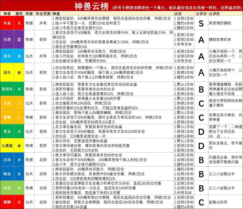 方便大家看,我给整理了一下,评分和评价看个乐就行,毕竟楼主一个解锁完神通的神兽都没有