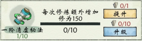 本体120修炼速度,满级10级,每级提升30修炼速度、升级需10个清虚秘法心得,满级共需100个清虚秘法心得,满级420修炼速度。