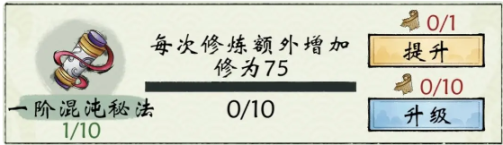 (1)一阶混沌秘法:本体60修炼速度,满级10级,每级提升15修炼速度、升级需10个混沌秘法心得,满级共需100个混沌秘法心得,满级210修炼速度。