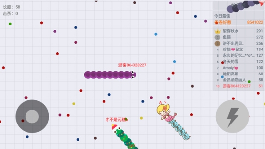 1.控制摇杆走位你的小蛇,吃掉地图上彩色的小圆点,就会变长。