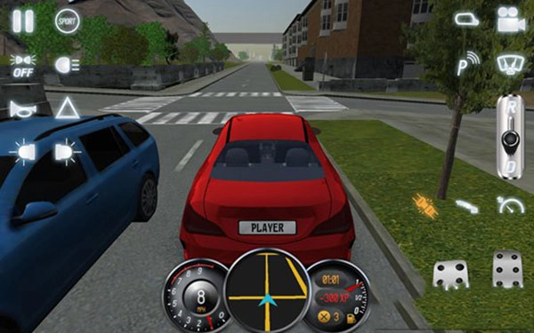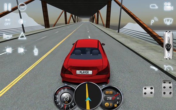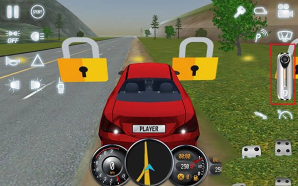 7、屏幕左侧设置有启动按钮、雾灯、大灯、喇叭、危险警示灯、左右转向灯、通话器等,而屏幕右侧配备了后视镜、视角转换、驻车雷达、雨刷、变速器、手刹、速度指示表等,用户只需点击这些功能按钮,就能查看相应的效果。