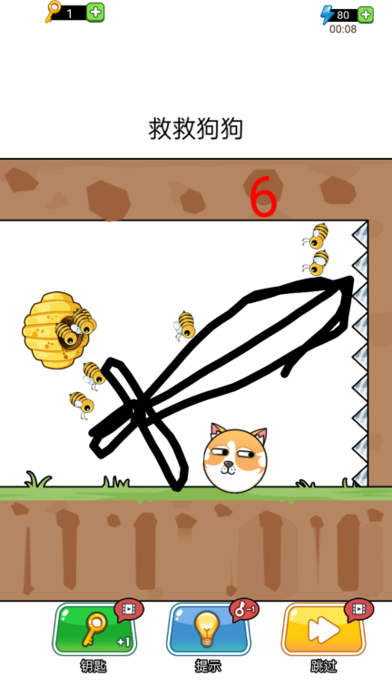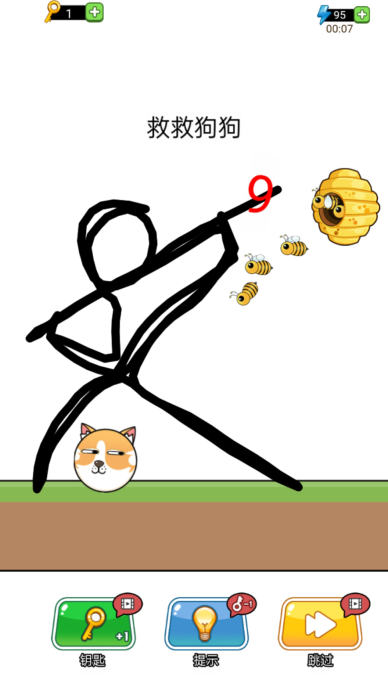 2、蜂群热衷于在狗蛋头上蛰刺。玩家得开动脑筋,画出一条线,使狗能拦住它们。