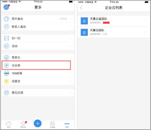 登录安装好的个人云盘移动端,如果已经开通或已加入企业云盘,直接进入企业云盘列表界面;如果暂未开通且未加入企业云盘,提示用户联系管理员或开通新企业云盘。