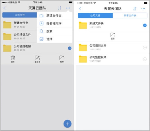 支持Web端、PC端以及移动端(iOS、Android)。用户通过手机号码注册天翼账号,就能登录访问。若关注微信企业号“21CN微企云”,可在该微信企业号内体验企业云盘功能。