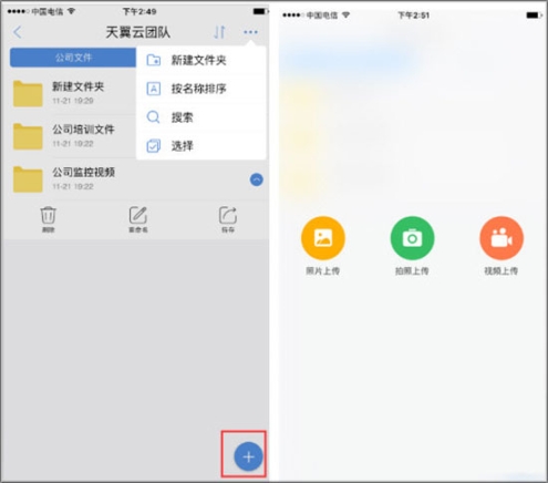 超级管理员与文件管理员在公司文件列表中点击上传按钮,随即弹出上传框。其中,安卓端能够选择拍照、照片、视频以及文件进行上传;而iOS端则可选择拍照、照片和视频上传。在选择好相应文件后,点击确定即可。