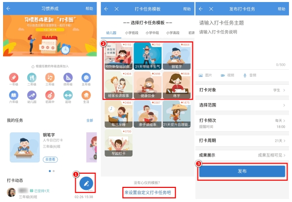开启app,进入“习惯养成”应用界面,轻点应用首页右下角的“铅笔”图标,既可以挑选合适的打卡任务模板,也能够自定义打卡任务。接着设置具体的打卡内容,比如打卡对象、打卡频次、打卡周期等,全部设置好之后,点击“发布”按钮就完成操作了。