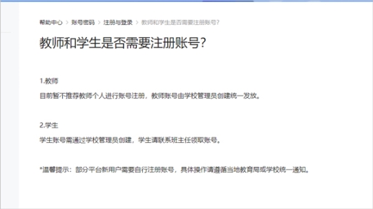 其中有个帮助文档中强调过老师和学生的注册账号的方式均不是由个人操作的,教师账号由学校管理员创建统─发放。