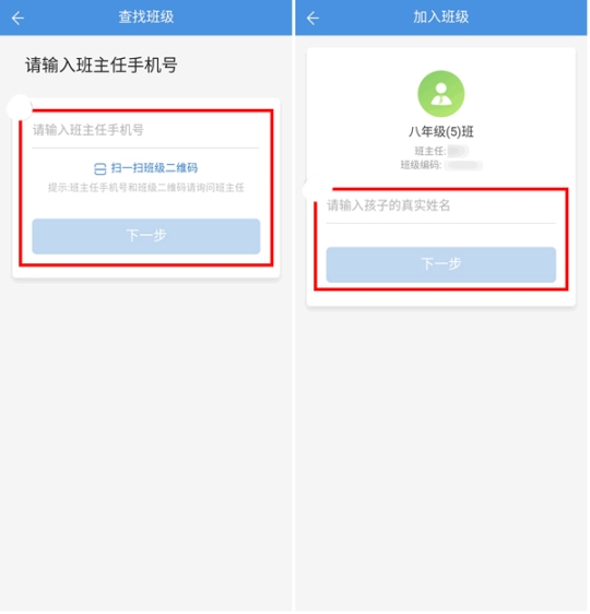 家长注册账号时需要输入班主任手机号或扫一扫班级二维码,核对孩子的班级和班主任后输入孩子的姓名
