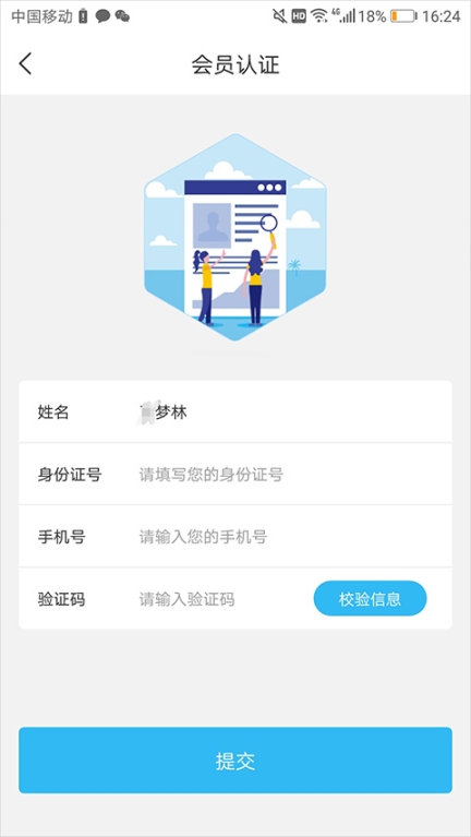 2、于打开的认证页面里,按顺序输入姓名、身份证号、手机号,还有点击【校验信息】获取到的验证码,输入完上述信息后,点击【提交】。