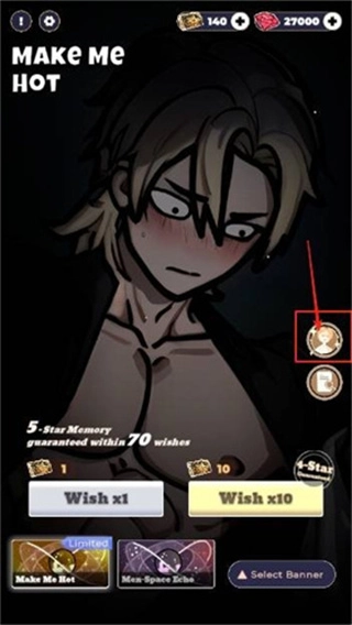 1. 进入游戏后,左边的是单次抽奖,右边的是十连抽,累计70抽必定获得五星物品。