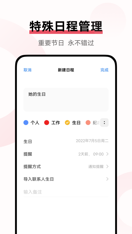●按你的日历分类,记下你的计划(新建日程)。