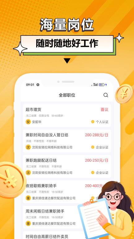 - 安全可靠,让你做兼职更安心。这里的各类岗位均经过严格审核,并且每天都要进行签到。