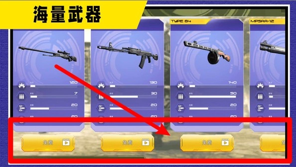 2. 轻点武器下方的“免费”按键,可通过观看广告或者完成任务的方式,来解锁更多枪械,从而充实武器库,提升火力。
