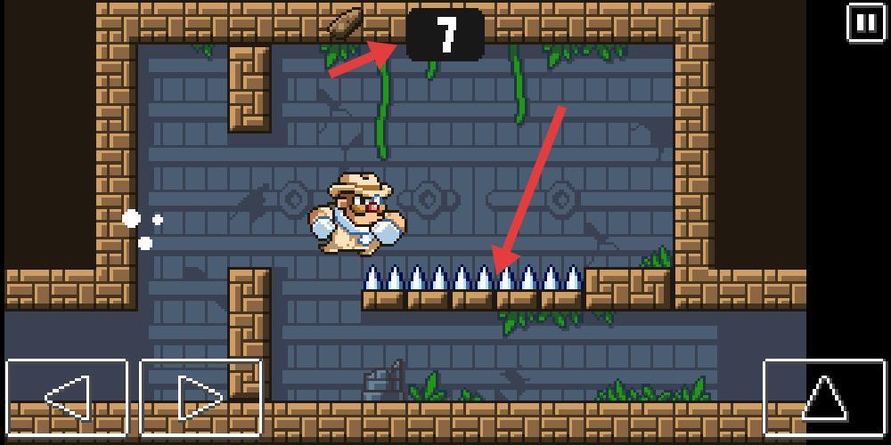 3、像素角色面对尖刺陷阱上方数字7提示剩余步数,需巧妙操作躲避危险,背景藤蔓与砖块营造复古冒险氛围,考验玩家反应与策略。
