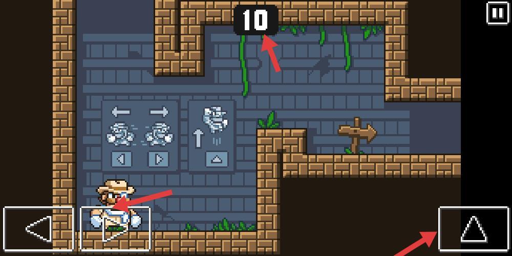 2、在游戏关卡里,像素角色处于砖块搭建的场景中,上方的数字10代表着剩余可操作的步数,左侧的箭头按钮用来控制角色移动,右侧的三角按键则是跳跃功能键。场景周围还分布着各类机关和可供行走的路径,玩家需要提前规划好每一步的操作,才能顺利通过这一关卡。
