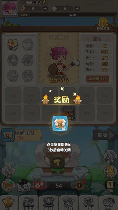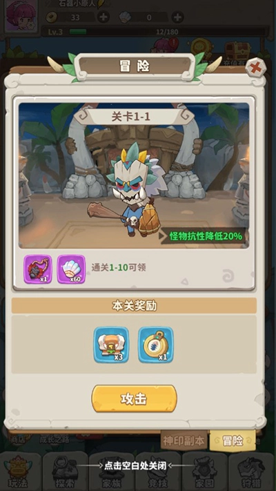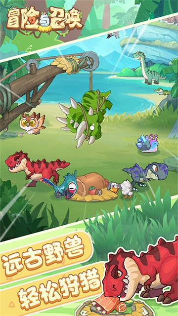 《冒险与召唤》是一款充满卡通风格的休闲放置策略类手游。玩家会踏入石器时代的奇幻天地,在这里,你将化身为小原人,与诸多远古异兽一路同行,开启一场激动人心的冒险征程。和传统角色扮演游戏有所区别的是,在《冒险与召唤》里,无需通过与怪物对抗来获取装备或是提升等级,只要持续开启眼前的宝箱,就能轻松收获各类强大的远古神级装备,依靠这些装备,你会变得愈发强大。