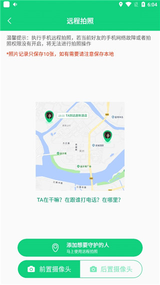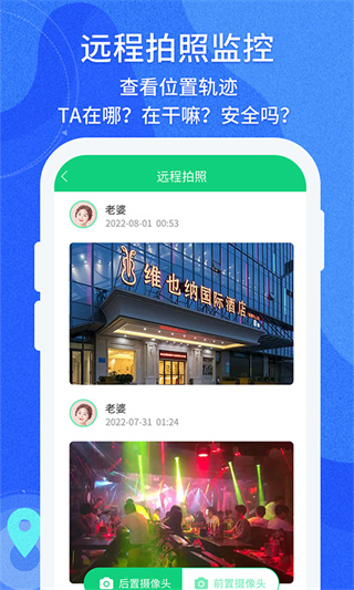 2、通过手机前置、后置摄像头拍照,可以实时查看TA的位置所在;