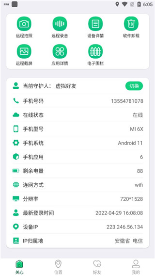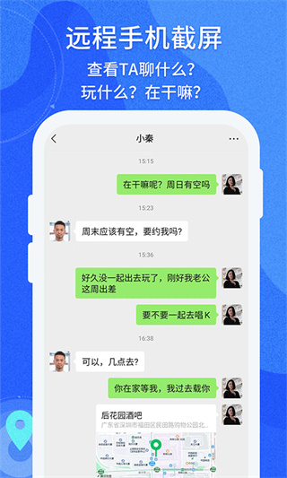 5、远程截屏: 通过手机截屏功能,随时掌握对方的手机使用状况,保障其安全;