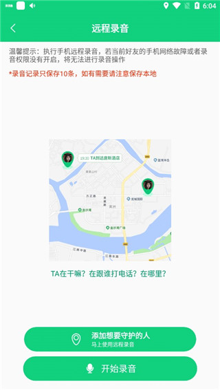 1、进入守护亲友,你可以通过远程录音功能,时刻掌握亲友周边环境情况,保护TA的安全;