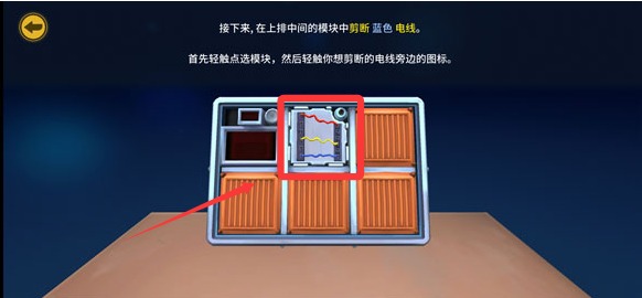 2、接下来,在上排中间的模块中剪断蓝色电线,首先轻触点选模块,然后轻触你想剪断的电线旁边的图标。