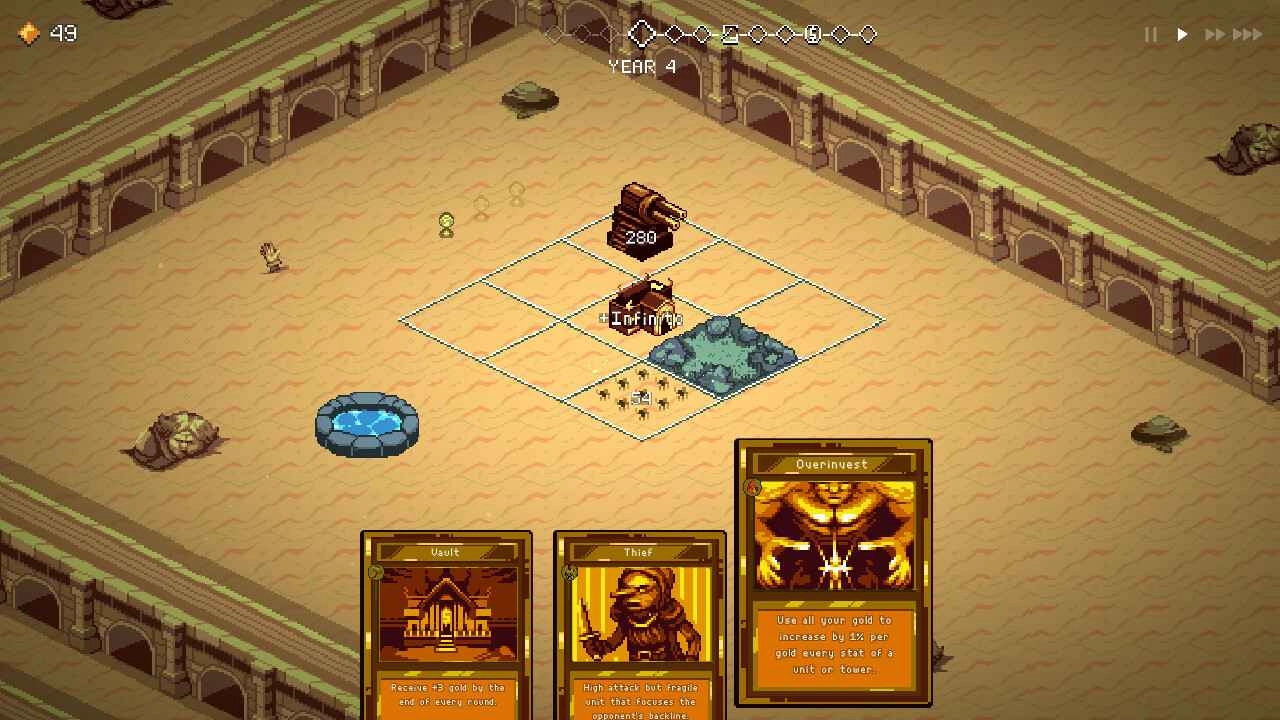 这是一款兼具战略元素与Roguelike特色的益智游戏。在游戏里,你需要打造一个强盛的王国,使其具备抵御外敌入侵的能力,进而赢得伟大统治者的荣耀称号。