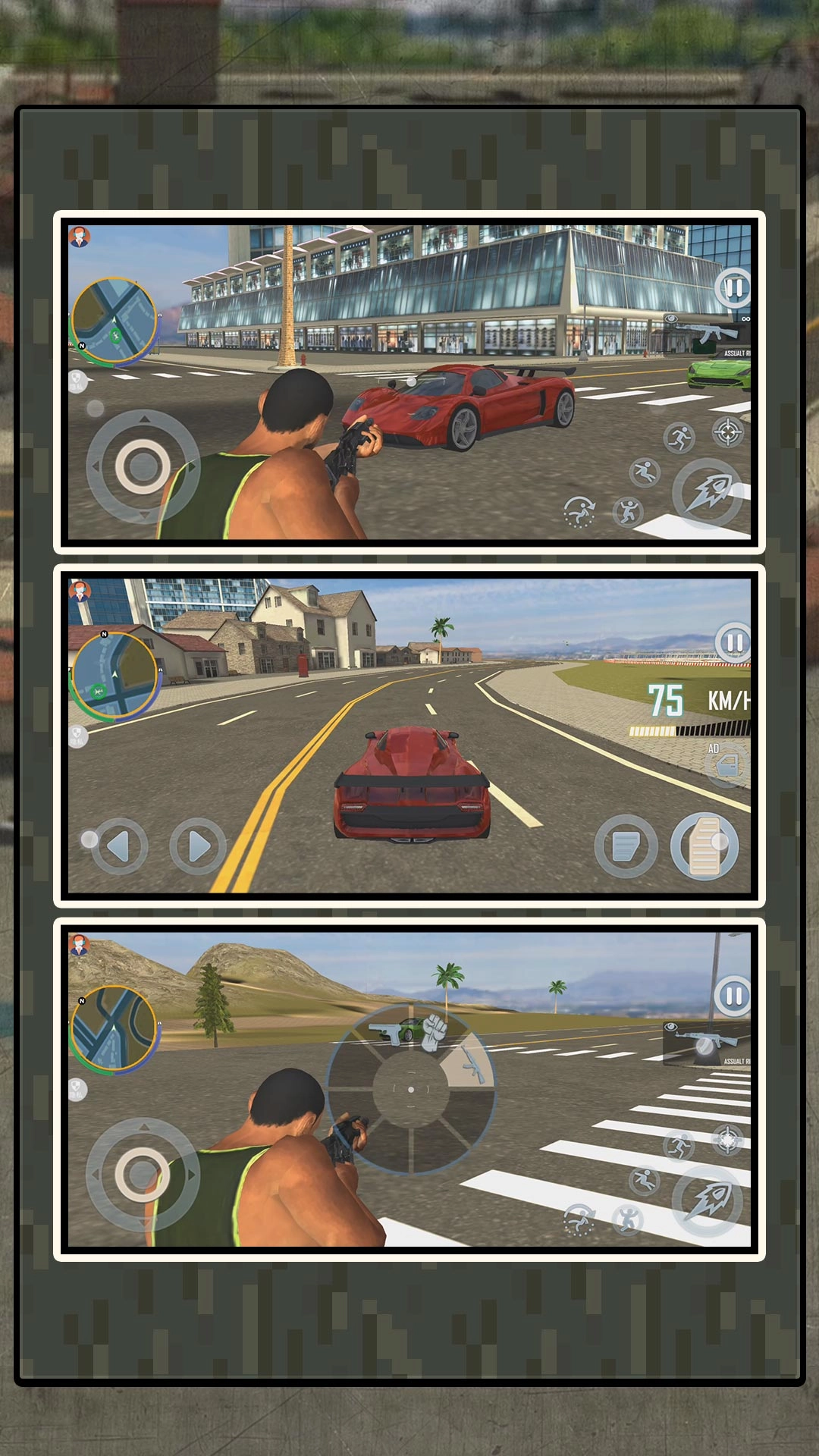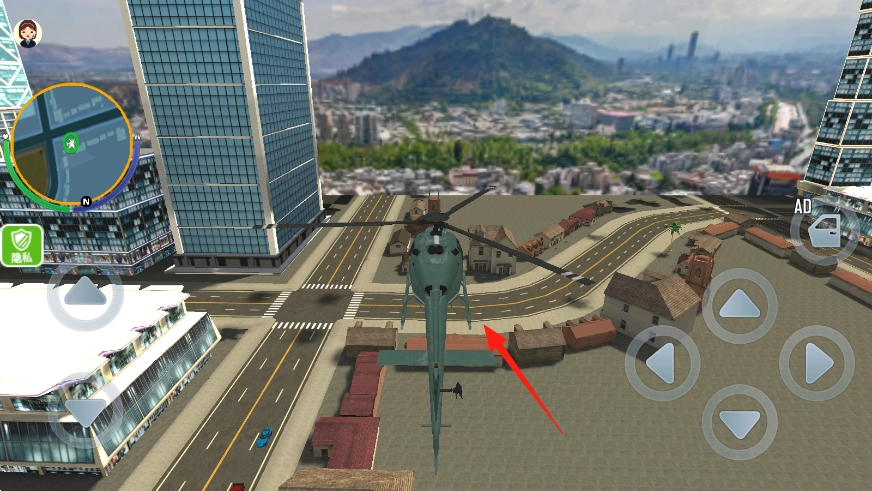 1. 进入游戏后,显示界面呈现出城市街道、房屋、建筑、直升机以及高空俯瞰视角。通过操作左侧按钮,能够对行走方向进行控制。