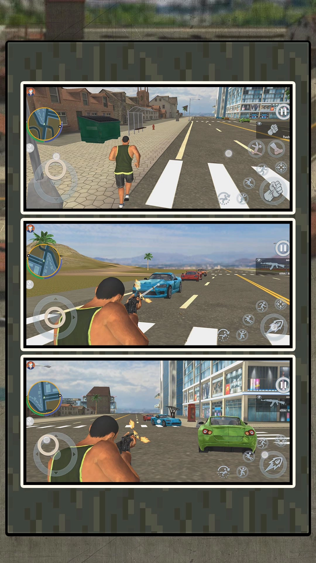 2、如图所示,男性角色身着绿背心与黑短裤,界面设有移动摇杆,以及拳击、踢腿等动作按钮,玩家可操控角色在城市中自由行动与互动。
