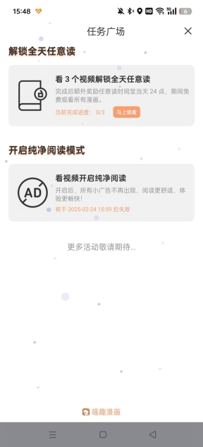 【观看3个视频解锁全天任意阅读】:完成后,将额外获得当天至24点前的任意阅读时间,在此期间可以免费阅读所有漫画;