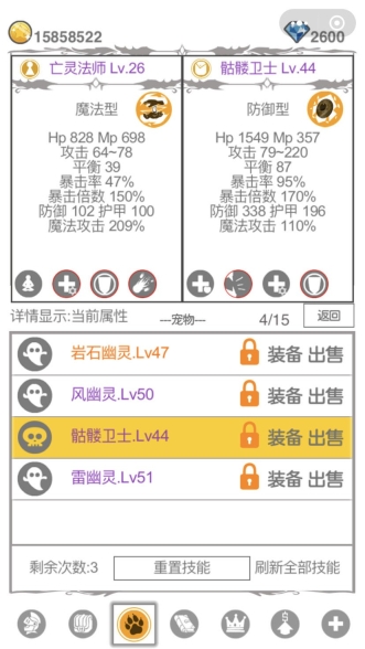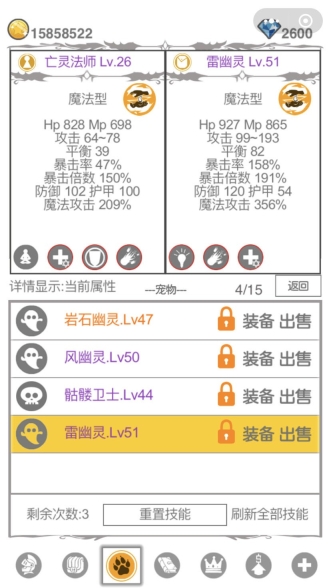 这款游戏整体偏向放置类,在萌新阶段,每天看完广告后就挂机,等待刷出较好的装备换上。我个人还挺享受这种打宝游戏带来的乐趣,游戏玩法核心在于堆砌属性面板。就宠物技能搭配而言,当前玩法较为单一,主要是灼烧流和雷电流,到了后期大家基本都选择防御流,感觉攻击型宠物不太受欢迎?