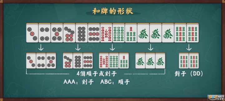 當自己的手牌形成了4個(順子或刻子)+1個對子,就達到了麻將的最終目標——和牌。