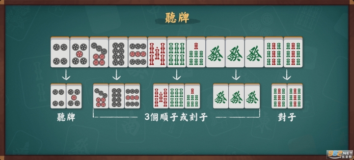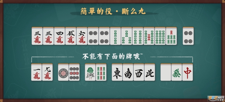 當牌種不含所有的數位1和9、風牌、三元牌時,並符合和牌的規律時即可和牌,可以吃碰,新人之友。