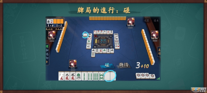 当任意一家打出的牌,能够与手牌中的2张构成刻子时,就能够选择点击“碰”把牌碰过来,并打出1张不需要的牌。