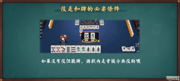 “役”是特定牌的組合,不滿足任何役是無法和牌的,所以一定要注意哦