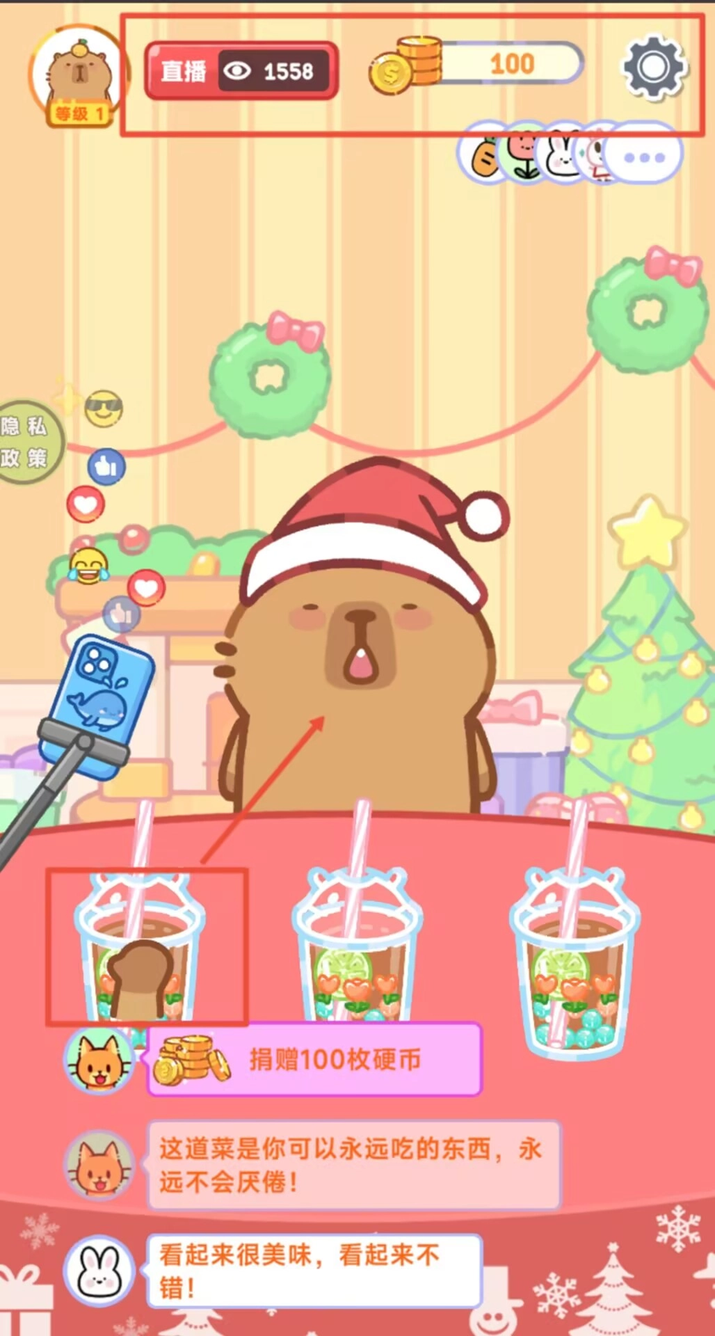 2. 在直播界面的上方,会实时呈现观众人数以及金币收益。只需把食物拖到小熊角色那里,就能完成互动。而直播界面的下方区域,则是用来展示观众留言的。
