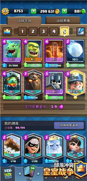 1、骷髅军团+哥布林飞桶+飞龙宝宝+野蛮人滚桶+哥布林小屋+火球+骷髅墓碑+猎人,平均消耗圣水3.5。