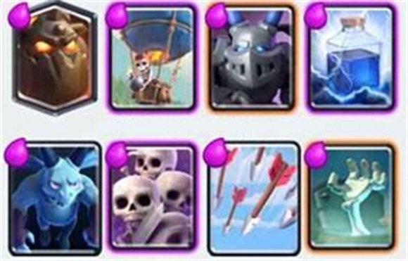 3、巨人气球兵组合:这套组合曾是最强推进卡组之一,以肉盾巨人掩护气球兵直扑敌方防御塔;滚木与小闪电圣水消耗极低,能有效辅助气球兵和巨人;搭配野蛮人、弓箭手、小亡灵,无论对空还是对地防守都颇具实力。