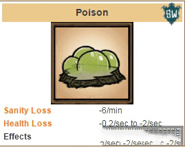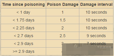 当玩家角色中毒时,其受到的伤害并不是恒定不变的,随着中毒时间的增长,中毒造成的伤害以及中毒发作的频率都会变得越来越致命。此外,理智值将以每分钟6点的速度下降,并且玩家的饥饿度减少速度会减慢20%。以下是中毒后伤害与频率变化的具体情况: