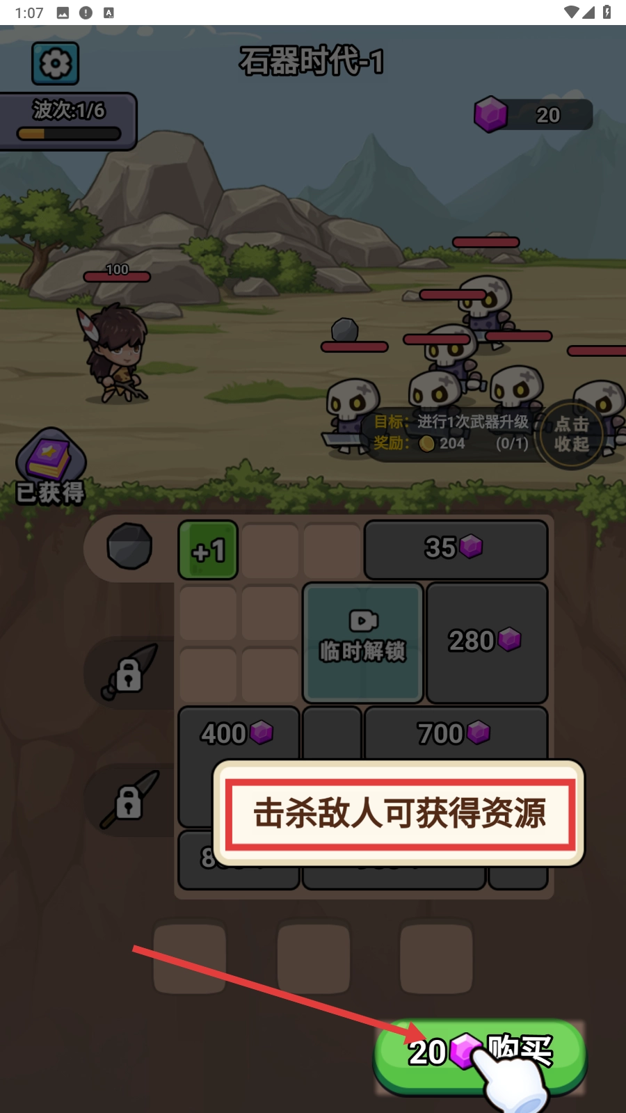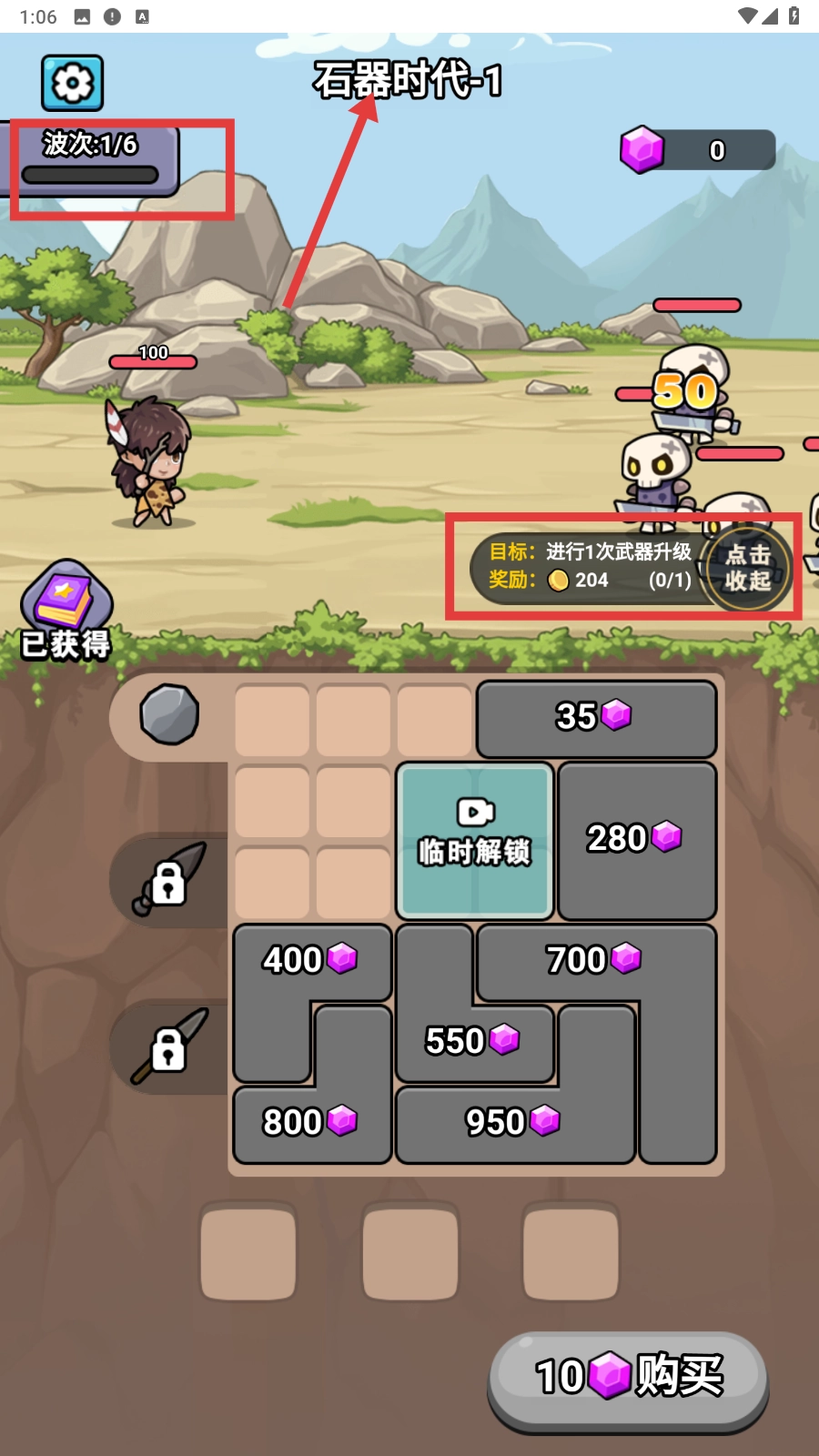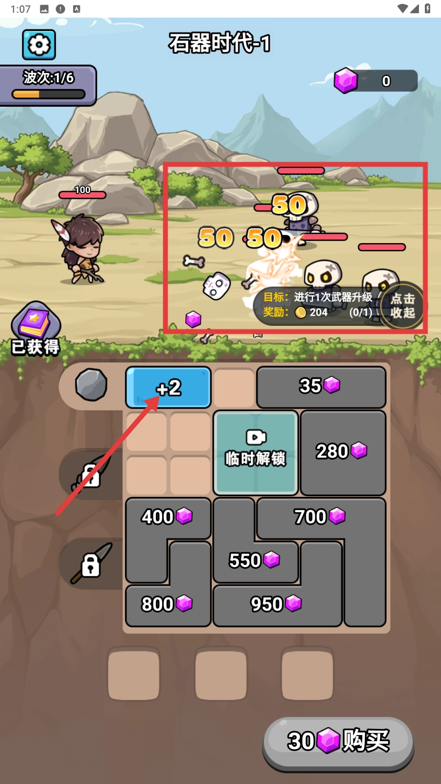 1. 当进入【石器时代 - 1】关卡时,留意界面左上角的【波次1/6】,以此知晓当前波次的进展情况。