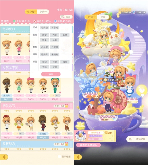 然而,游戏里的卡牌战斗玩法并非复杂难懂,玩家取胜其实不太依赖卡牌搭配的策略性。虽说游戏针对每一张库洛牌都设计了诸如加速、蓄力、回复、输出、AOE等特殊技能效果,但从本质而言,玩家提升战斗力还是依靠收集手办与战斗服来强化自身的属性面板。