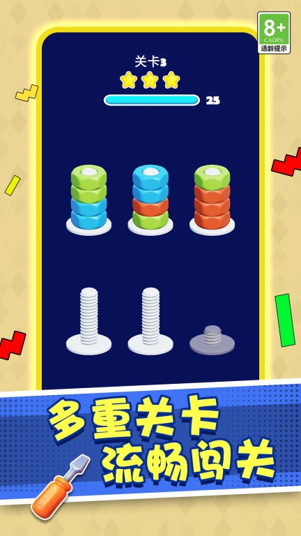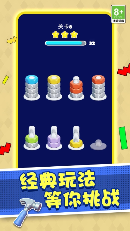3、治愈风格的画面效果:每当成功配对时,都会触发流畅的螺纹咬合动画,并伴有ASMR级别的机械音效,为用户带来放松解压的体验。