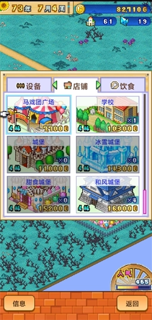 2、建议将上一个地图建造的城堡类店铺拆除带到新地图使用(人气,品质,价格都升满),可以帮助你在新地图快速赚钱。