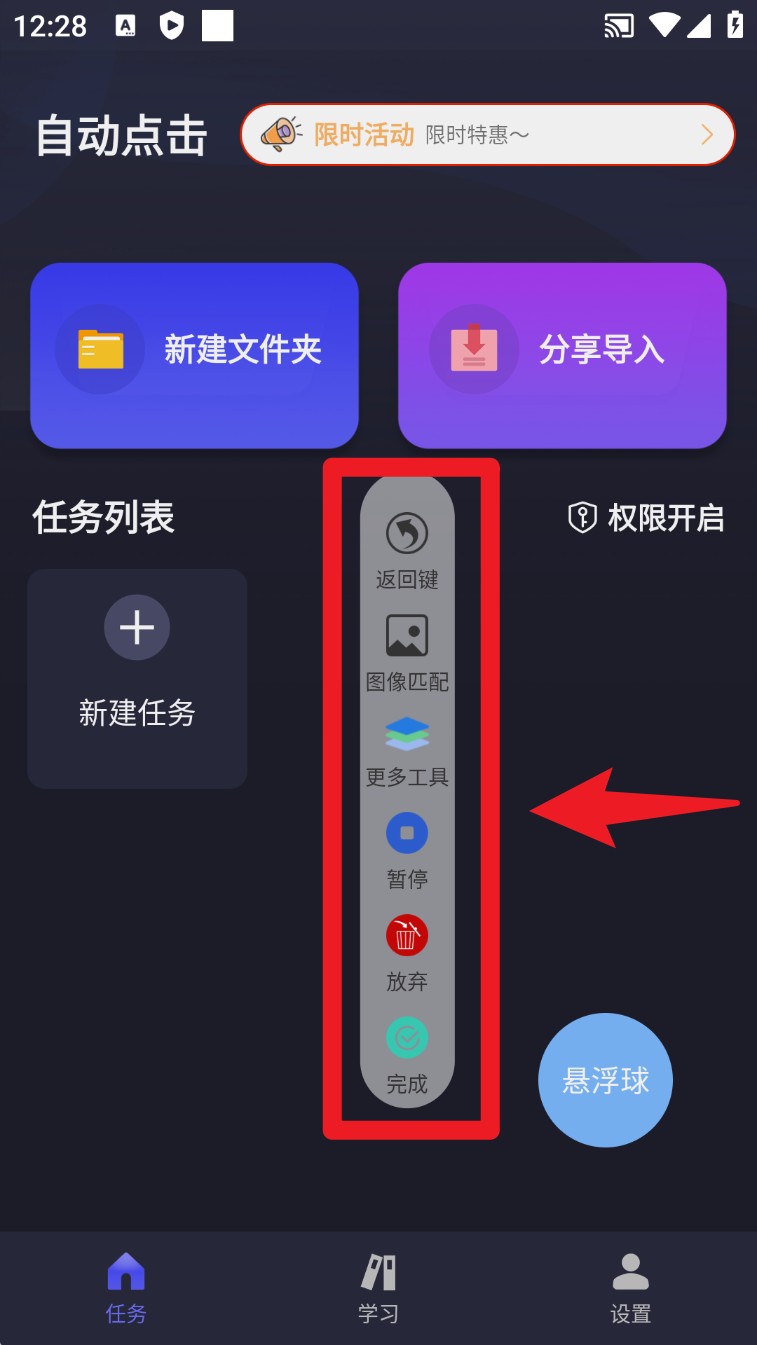 4. 在任务编辑界面,利用左侧浮动工具栏添加返回键、图像识别、暂停等控制指令。