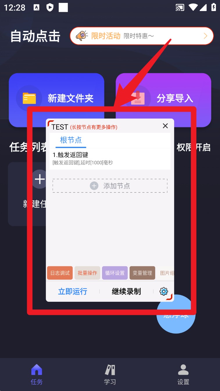 5. 创建完成后,点击节点设置参数如延时、循环等,然后可选择立即执行或继续录制。