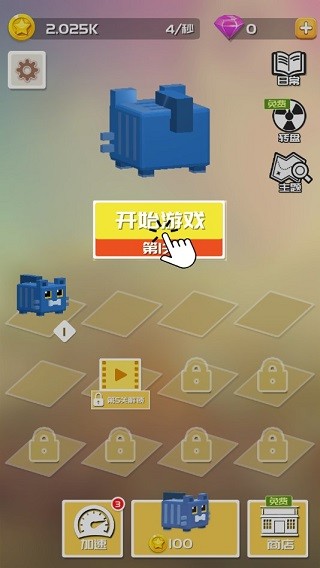 首先打开游戏映入眼帘的便可这些可爱的萌萌生物,方块式的像素造型,十分惹人喜爱,在此界面下,你可以通过购买来增加小动物的数量,而相同动物之间,能够两两合成,出现新的动物品种那,不仅如此,合成等级越高,所获得的离线收益越大,努力解锁更多方块,合成更高等级的小动物吧。