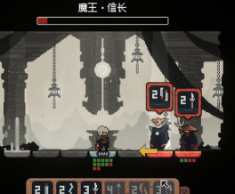 游戏的BOSS战除了秀吉的招式比较诡异,很多时候原因不明的扣血以外,其他的大多是比较好规避的,基本上难点在於普通战斗,很容易一步错步步错,不过游戏提供了敌人掉落道具的设定,有回血、加盾、群体冰冻、群体诅咒、群体中毒和重制角色技能,灵活应用道具可以大幅增加容错率。
